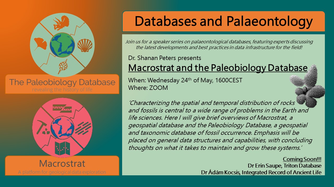Join us for a speaker series on palaeontological databases. The last talk in part 1 of the series will be by Dr Shanan Peters on the Paleobiology Database and Macrostrat, 24h of May, 1600 CEST, on Zoom. Please register for updates on the talk series by filling out the form https://fau.zoom.us/webinar/register/WN_RCaMmIhJRI2ZUNiQmTU_DA