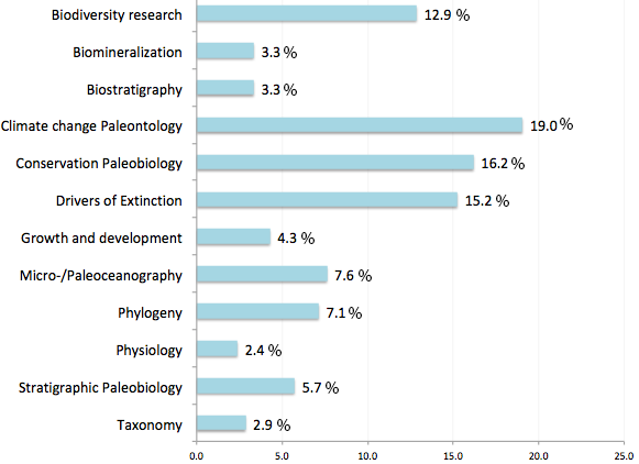 Clearly in the lead is Climate Change Paleontology followed by Conservation Paleobiology and Drivers of Extinction.