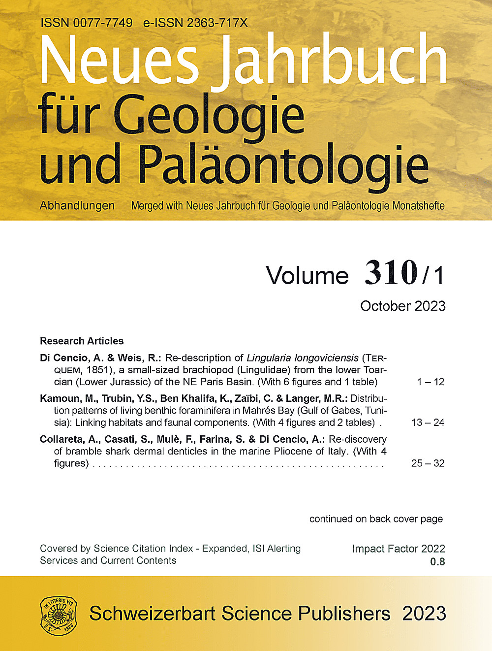 “The plant macrofossil assemblage from a Rhaetian succession of a quarry near Einberg (Franconia, Germany), of which ferns, cycadophytes and ginkgophytes had been published earlier, comprises two conifer species (Schizolepidopsis liasokeuperianus and Stachyotaxus septentrionalis) that are unambiguously identifiable. Though both occur in small numbers of specimens only, a large number of specimens of the enigmatic gymnospermous foliage type Desmiophyllum harrisii were encountered; the true nature of this taxon is yet unknown, but evidence points towards a coniferalean affinity. The three species are described by means of macromorphology and epidermal characters. Finally, a large number of conifer cones have been found in the assemblage, which are attributed to three different types, viz., one ovuliferous cone belonging to and attached on a twig of Stachyotaxus septentrionalis; the microsporangiate cone Sphaerostrobus einbergensis sp. nov. and the ovuliferous cone Ourostrobus einbergensis sp. nov. – the latter two might belong to Desmiophyllum harrisii. A comparison between the flora from Einberg with the Rhaetian floras of adjacent localities (viz. Wüstenwelsberg, Heilgersdorf and Kipfendorf) reveals distinct regional differences within the conifers between the respective floras; this is most likely induced by local ecological disparities of varying habitats. Moreover, brief comparisons with Rhaetian floras from adjacent European areas are made, and with the Hettangian floras from Bavaria as well. Lastly, an overview of the complete Einberg plant fossil assemblage is given, including palaeoecology and palaeogeography of the whole area around Coburg during the Rhaetian.” Published in Neues Jahrbuch